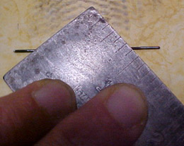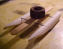 Holes were drilled just inboard of the centerlines in each trough to fit the spreader struts, and the wires were carefully measured and bent to achieve the correct width (45.5mm between float centerlines, measured at bow and stern). The alignment rectangle drawn on the work surface is my cheap substitute for a grid-printed work mat. Later, smaller holes will be drilled at the centerlines to pin the mounting struts securely in place: |