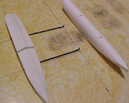 A pair of P6 floats in preparation. Black annealed wire was chosen to fit flush in the mounting troughs as tightly as possible, cut longer than needed and rolled out straight between a steel straightedge and some scrap countertop (this last is Standard Operating Procedure for wire fabrication work). |