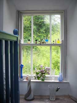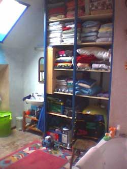 | The upstairs actually looks very good now, apart from the floor which still needs covering. But with the plaster dust all painted over, Mike got some rugs out of storage to cover most of the splintery boards. He also built shelves in the bathroom, and filled them! | |
