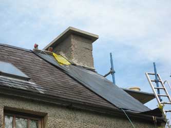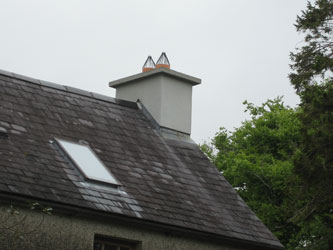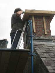 | Tania only got to spend a couple of months here this summer, but Mike stayed on and continued to get things done. I can't even remember how long ago we wrapped our north chimney in plastic. It was a last minute emergency measure before we left one summer to stop the water that was coming in around the flashing when the chimney got rained on. Mike had made a former for a chimney cap many years earlier, and the time has come to put it to work. Our friend Billy came to lend a hand again. That looks better. | |