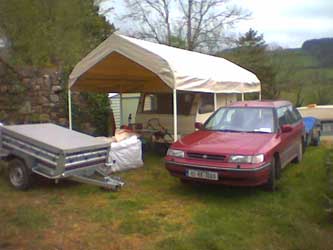 The canvas carport we set up for guest accommodation had become a storage area, and was blocking our garden view in the courtyard. We'd moved the caravan up to our parking area a couple of summers ago, and now moved the carport (minus its sides) there to protect the caravan. Between that, the Subaru, two trailers, some building and gardening supplies and a big collection of potted trees waiting for planting, the parking area is getting a bit crowded.![]() |