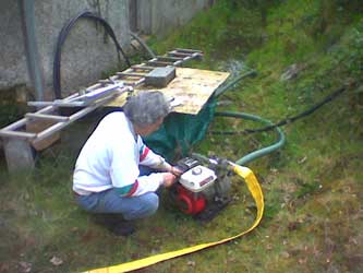 For the past couple of summers we've had an unwanted pond at the back of the house - sometimes a lake if it rained a lot. Mike decided it was time to try out his water pump. It took awhile to get it started - the thing hadn't been run in many years - but once it was going, it took no time at all to clear the water. And there at the bottom was a sheet of plastic that had escaped from the roof. Now we know how to create a pond if we want one.![]() |
