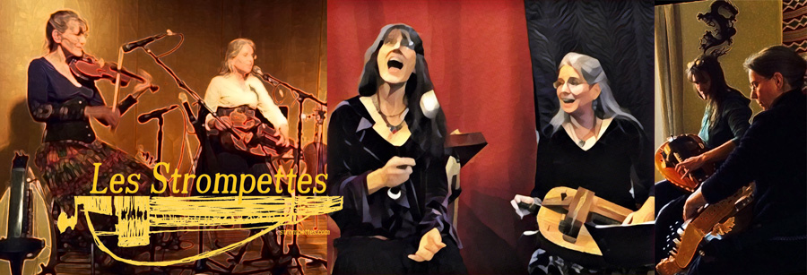 Two hurdy gurdy devotees join forces to weave an eclectic musical tapestry on the looms of long lost civilizations, shrouded in ancient folkloric mystery. The hurdy gurdy is an almost extinct wheeled violin with a keyboard, drones, a percussion section and a mind of its own. It's an impossible mechanical musical marvel of warped ingenuity hatched by a masochist with a passion for engineering and hard things to play, which goes some way to explaining the relative rarity of these fascinating instruments and the skill, bravery, doggedness and dubious sanity of those who dare to play them. The trompette is the buzzy string on the hurdy-gurdy. It's the most fun, most annoying, most compelling and most complex part of the instrument. We like it a lot; that's why we named ourselves for it. Lira Korbowa and Tiesse di Dj'va play hurdy-gurdies and a stack of other instruments, and have way too much fun. We are, at times, ably supported by "The Drones": Mickeleen O'Rarity and "Fastfinger" Billy Two Pints, accomplished and fearless musicians with many years of foolhardy adventure behind them and many more, it seems, ahead. Our not-so-secret alter egos, Felicia Dale & Tania Opland, spend our lives on the road with our respective husbands and music partners (William Pint and Mike Freeman). |